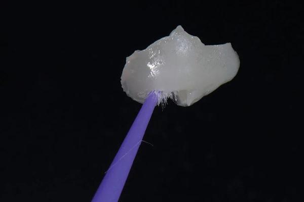 После анестезии зуб 2.6 изолирован коффердамом и частично рассверленным клампом (Фото 2). На всю поверхность непредпрепарированного зуба 2.6 нанесен тонкий слой разделительного агента — вазелина — микрокистью (Micro Applicator, Ultradent). Для изготовления окклюзионного индекса на поверхность зуба нанесен текучий композит для объемного внесения (Admira Fusion x-base, VOCO) (Фото 3). Микрокистью с легким давлением зафиксированы окклюзионные особенности и топография, создав необходимые детали на «штампе». Композит засвечен 20 секунд (Bluephase, Ivoclar); стержень микрокисти внедрен в композит, но не касается анатомии зуба.