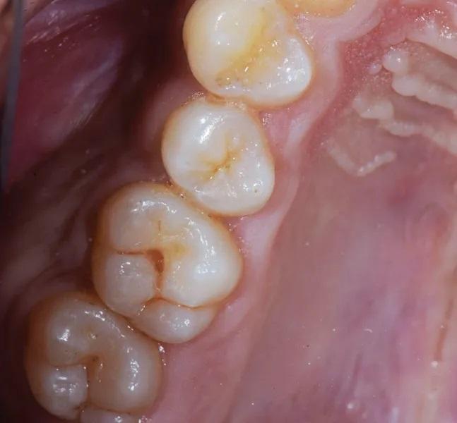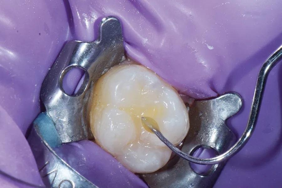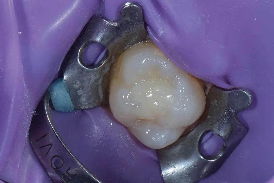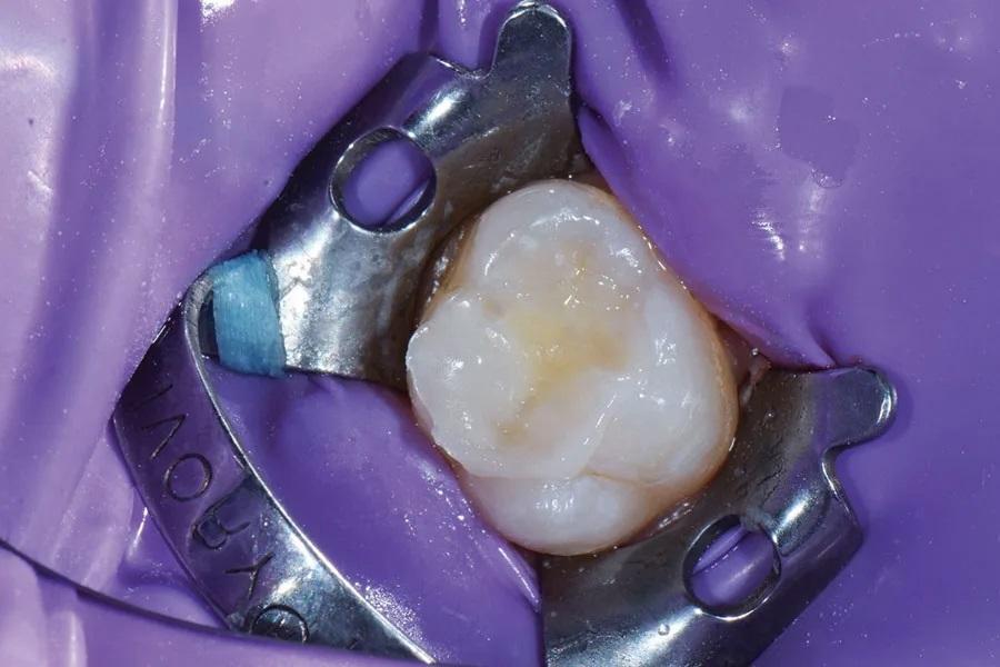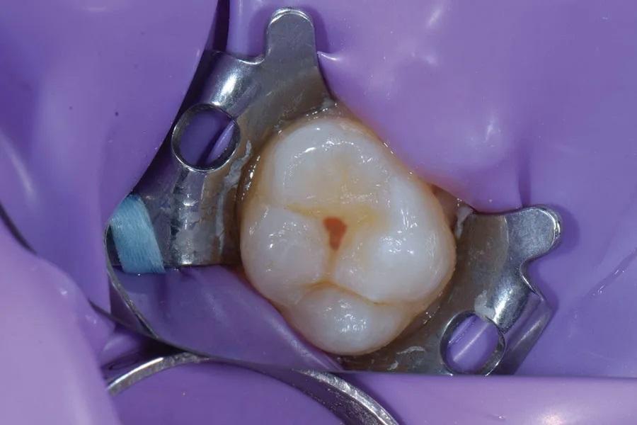 Пациент, мужчина 32 лет, направлен в клинику автора с жалобами на чувствительность зуба в левом верхнечелюстном квадранте к холоду и сладкому. При зондировании выявлен окклюзионный кариес класса 1 в центральной ямке окклюзионных фиссур зуба 2.6 (Фото 1). Выполнены прицельные рентгенограммы для оценки распространенности поражения и исключения вовлечения пульпы. Пациенту разъяснено наличие заболевания; показано прямое восстановление композитной смолой для устранения боли и чувствительности и восстановления функции и эстетики зуба. Пациент согласился; лечение запланировано на следующую неделю.