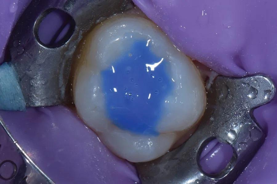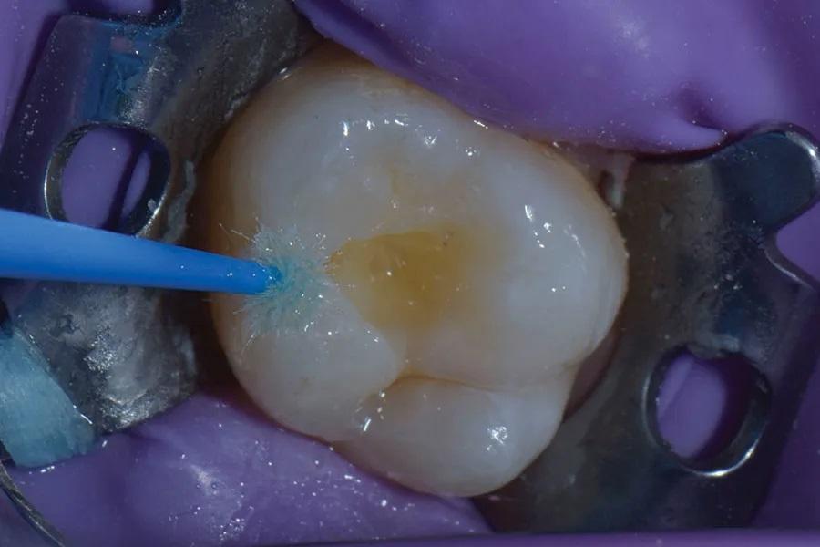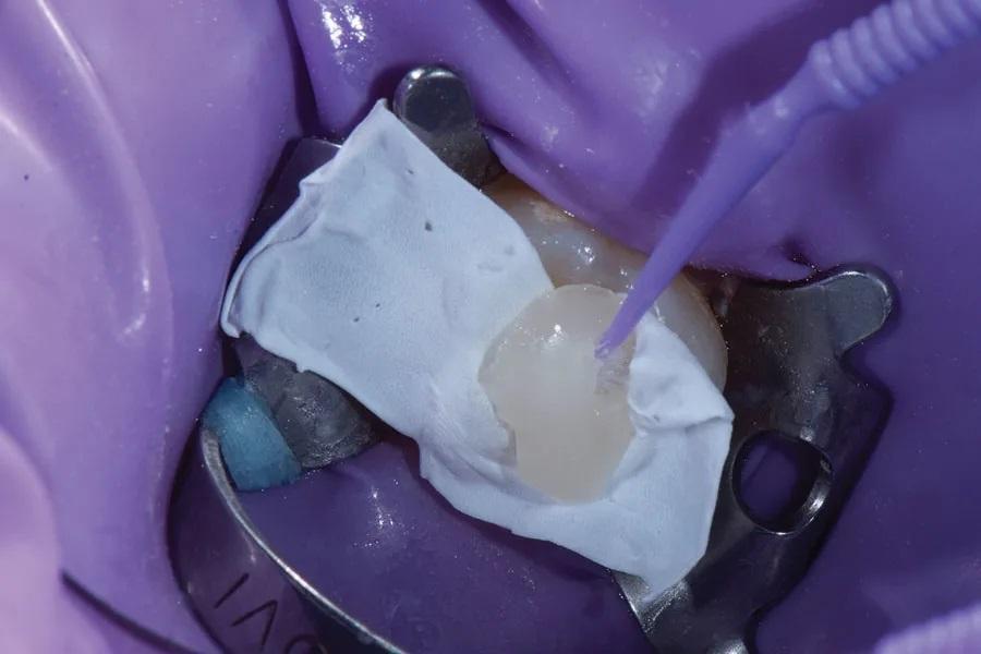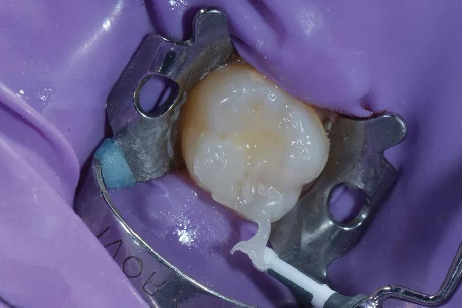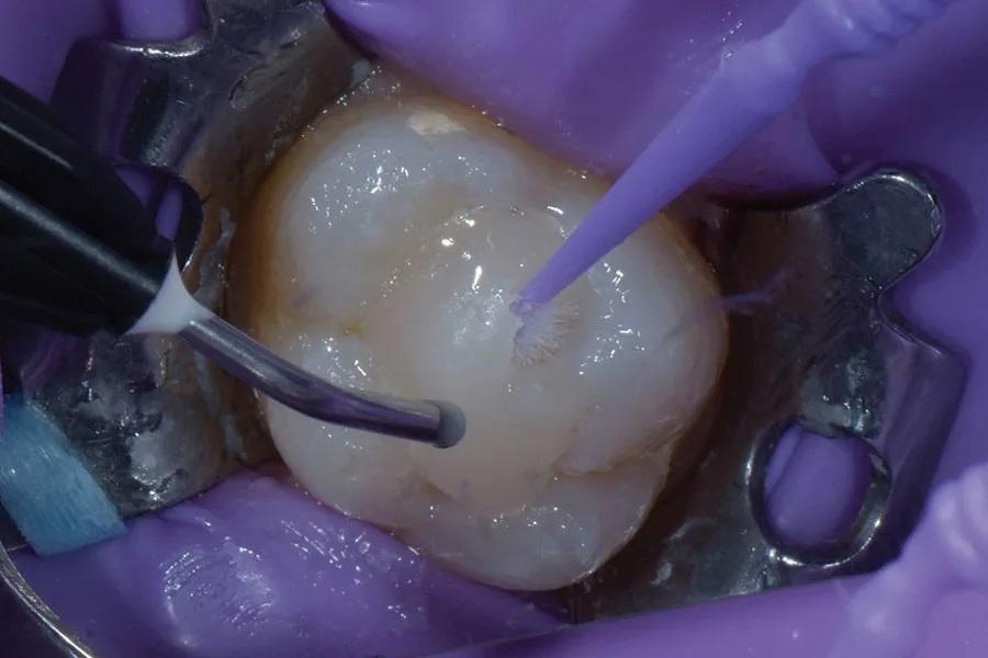 Фото 8. После протравливания и смывания нанесен универсальный адгезив.