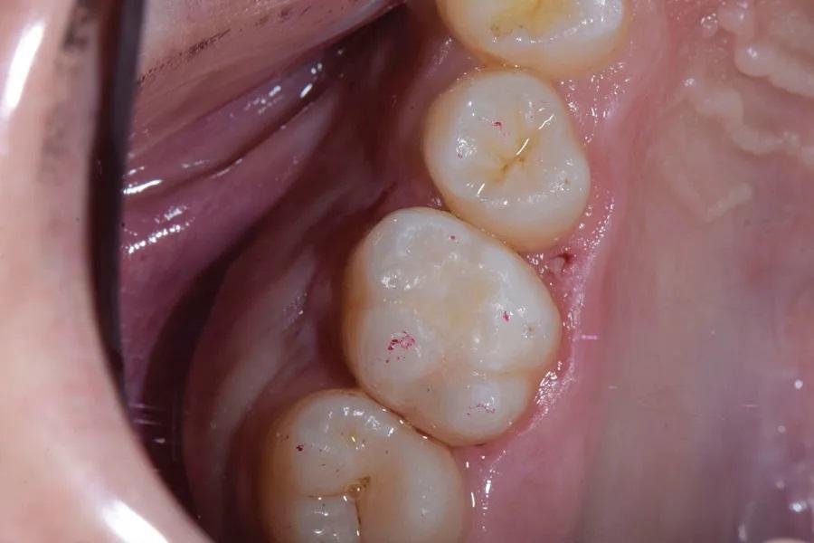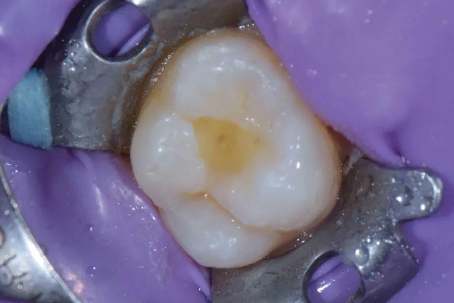 Фото 1. Пациент жаловался на чувствительность и боль в боковом моляре при воздействии сладких или холодных раздражителей. В зубе 2.6 был обнаружен кариес 1-го класса с окклюзионной стороны.