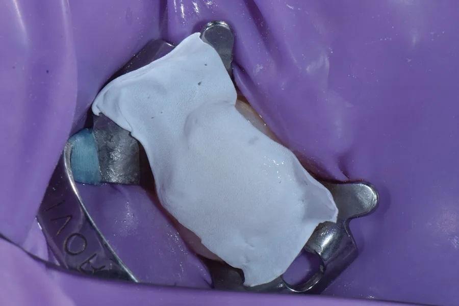 Поскольку дооперационная окклюзионная анатомия зуба 2.6 была интактна и не должна была измениться в ходе лечения, было решено использовать технику «штампа» для эффективного восстановления дооперационной окклюзионной функции. Хотя создание композитного «штампа» дооперационной окклюзионной анатомии добавляет времени на начальном этапе, эта техника призвана экономить время у кресла на завершающем этапе за счет минимизации или даже исключения длительных послеоперационных окклюзионных корректировок. Методика может быть полезна и при кариесе класса 2 с глубокими фиссурами, а также при изготовлении секционных штампов для диагностических восковых моделирований при реабилитации/стираемости.