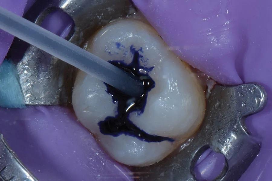 Фото 5. На зуб 2.6 была нанесена жидкость для определения кариеса, чтобы осветить участки кариозных поражений для удаления.